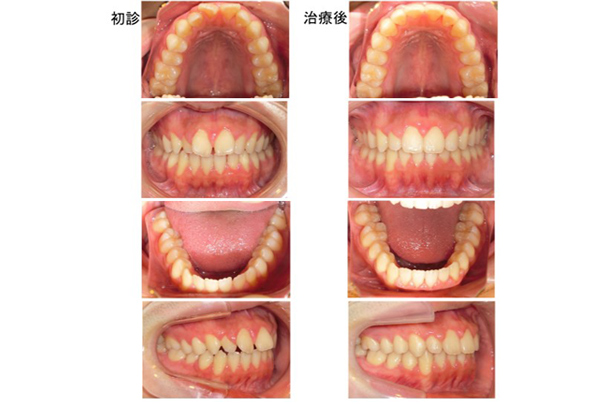 10代のころから上下の前歯にすきまがあり、最近になってすきまがさらに大きくなってきた気がするとのことでした。診査したところ上下の前歯の、歯と歯の間にスペースがあり、上の前歯に軽度のガタガタ(ねじれ)がありました。レントゲンを撮影したところ、全体的に歯周病により歯の土台(歯槽骨)が吸収してきていることが疑われました。歯周病の状態で矯正治療を行うと歯周病が悪化する可能性があるので、まずは一般歯科にて歯周治療を行ってもらうことになりました。歯石除去などの歯周治療を半年程度行い、歯槽骨の状態が十分改善したことを確認した上で、矯正治療を行うこととなりました。矯正装置は、歯周病の既往を考慮して歯の清掃性の良い「マウスピース型矯正装置」をお勧めしましたが、費用の面で安価な方が良いと希望されましたので、日々のブラッシングを徹底していただくことを条件として「マルチブラケット装置」で治療することとなりました。この装置はすべての歯に「ブラケット」というボタンを特殊な接着剤にて接着し、ワイヤーを結び付けて歯を動かしていく装置です。装置の構造からして歯石の再付着が心配でしたが、当院の歯科衛生士からのブラッシング指導の内容を徹底していただいたことと、月1回の受診時における当院でのスケーリング(浅い部分の歯石除去)により、安全に治療を進めることができました。治療期間9か月でスペースの閉鎖とガタガタが解消しました。治療後にレントゲンを確認したところ、歯槽骨の状態にほとんど変化はなく、歯周病の悪化はみられませんでした。現在は後戻り防止のリテーナーという取り外し可能な装置を使用しながら3か月に1回経過観察で受診されています。