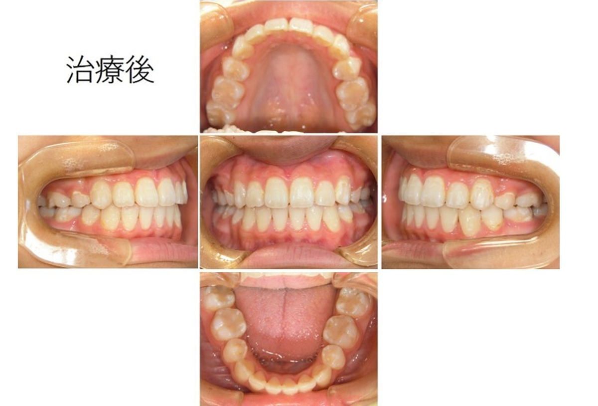 治療後、上下のガタガタと八重歯が解消し、中心のずれも治りました。見た目だけでなく機能的にもしっかり咬めるようになりました。